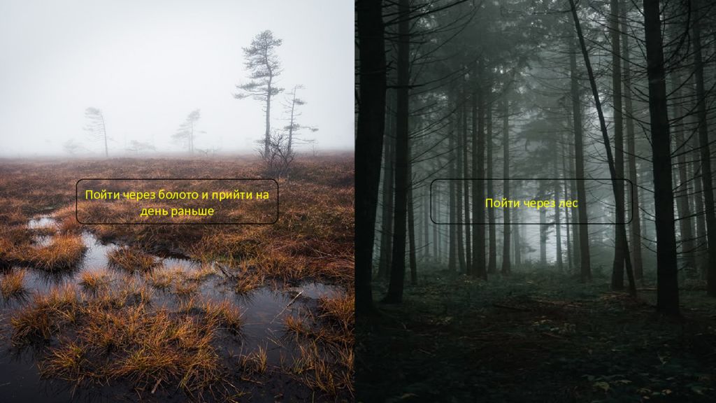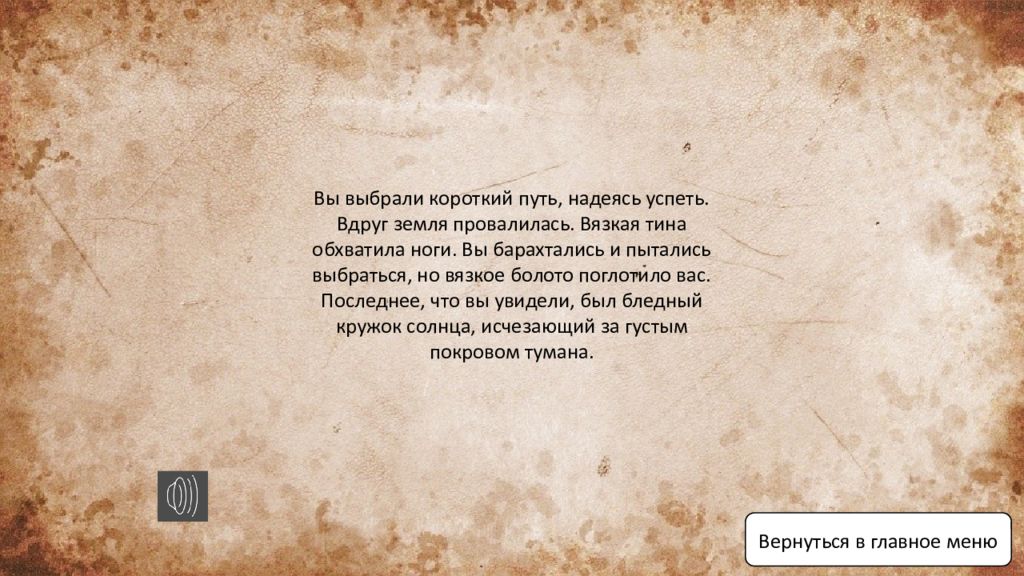 Вы выбрали короткий путь, надеясь успеть. Вдруг земля провалилась. Вязкая тина обхватила ноги. Вы барахтались и пытались выбраться, но вязкое болото поглотило вас. Последнее, что вы увидели, был бледный кружок солнца, исчезающий за густым покровом тумана. Вернуться в главное меню
