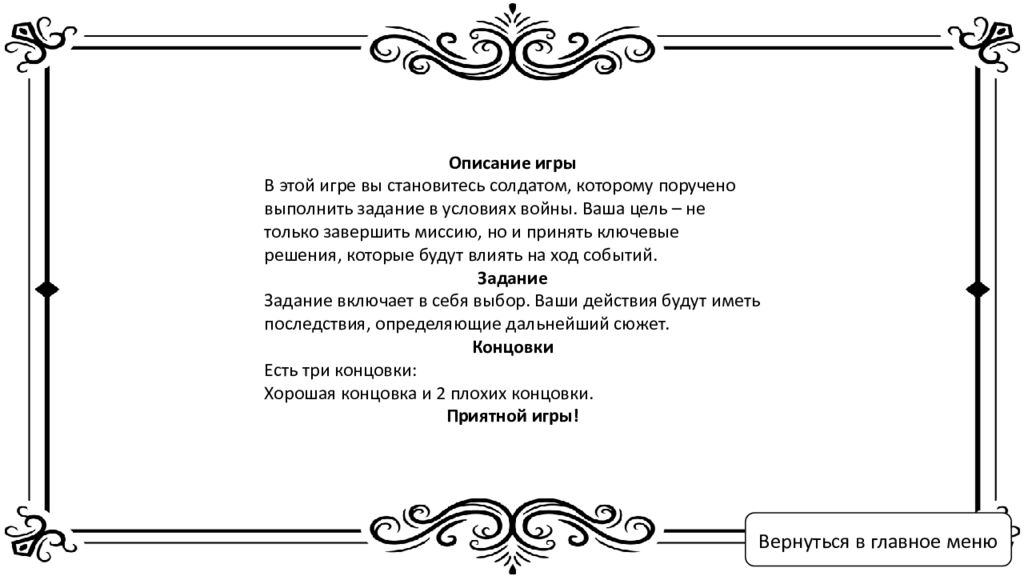 Вернуться в главное меню Описание игры В этой игре вы становитесь солдатом, которому поручено выполнить задание в условиях войны. Ваша цель – не только завершить миссию, но и принять ключевые решения, которые будут влиять на ход событий. Задание З адание включает в себя выбор. Ваши действия будут иметь последствия, определяющие дальнейший сюжет. Концовки Есть три концовки : Хорошая концовка и 2 плохих концовки. Приятной игры!