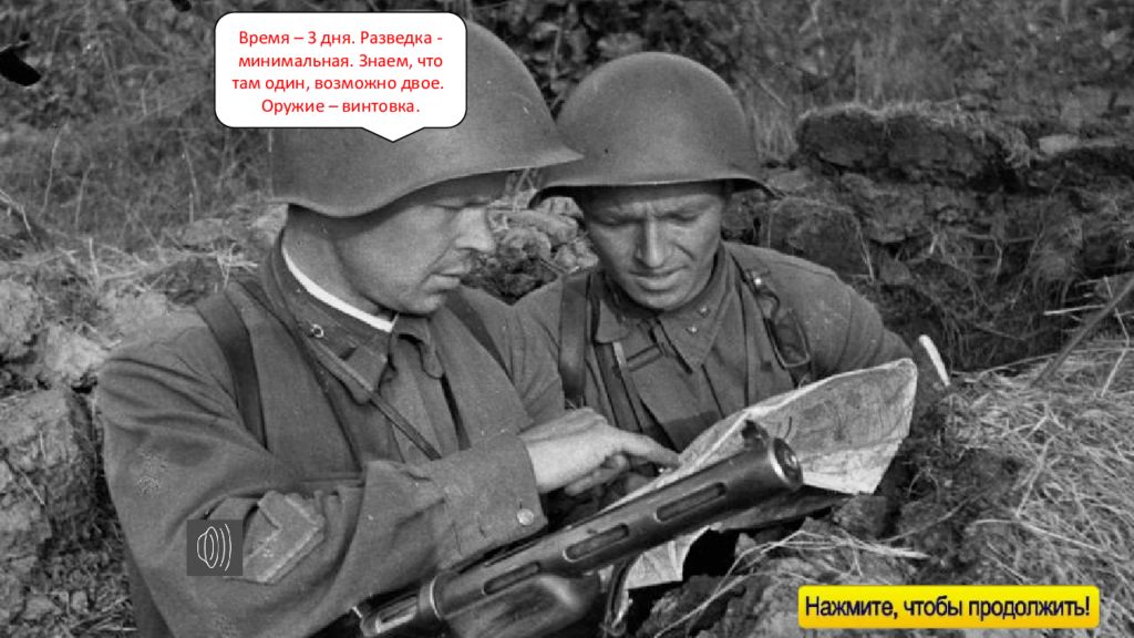 Время – 3 дня. Разведка - минимальная. Знаем, что там один, возможно двое. Оружие – винтовка.