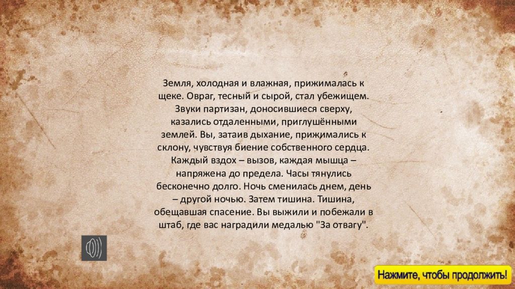 Земля, холодная и влажная, прижималась к щеке. Овраг, тесный и сырой, стал убежищем. Звуки партизан, доносившиеся сверху, казались отдаленными, приглушёнными землей. Вы, затаив дыхание, прижимались к склону, чувствуя биение собственного сердца. Каждый вздох – вызов, каждая мышца – напряжена до предела. Часы тянулись бесконечно долго. Ночь сменилась днем, день – другой ночью. Затем тишина. Тишина, обещавшая спасение. Вы выжили и побежали в штаб, где вас наградили медалью "За отвагу".