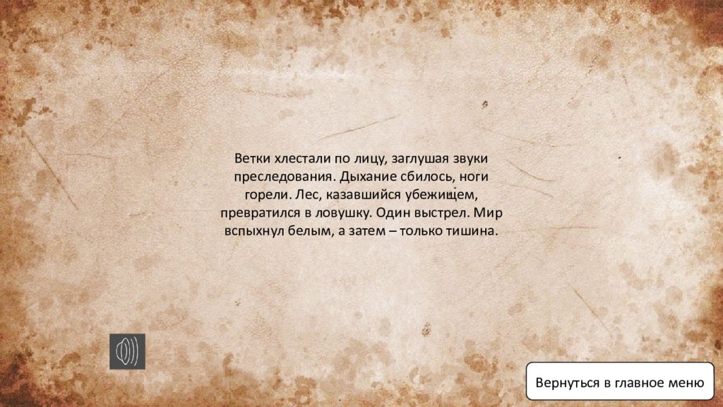 Ветки хлестали по лицу, заглушая звуки преследования. Дыхание сбилось, ноги горели. Лес, казавшийся убежищем, превратился в ловушку. Один выстрел. Мир вспыхнул белым, а затем – только тишина. Вернуться в главное меню