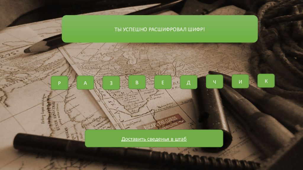 ТЫ УСПЕШНО РАСШИФРОВАЛ ШИФР! Р А З В Е Д Ч И К Доставить сведенья в штаб