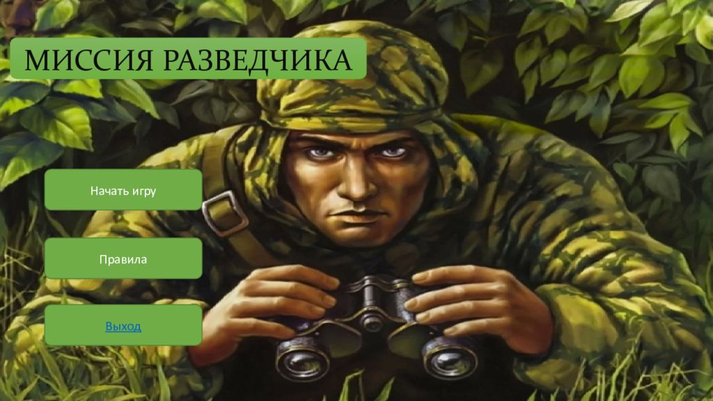 Последний слайд презентации: Начать игру Правила Выход МИССИЯ РАЗВЕДЧИКА