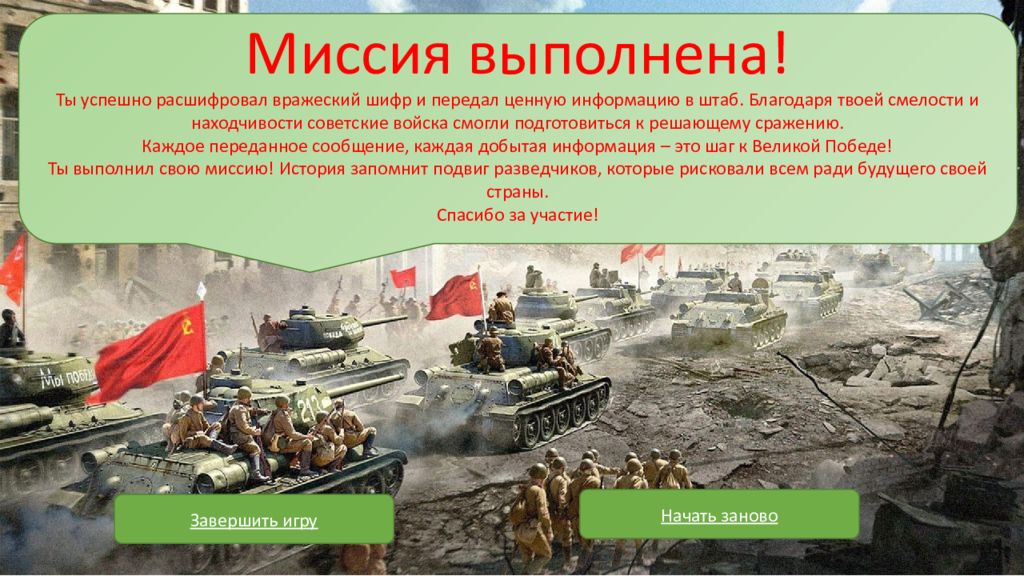 Миссия выполнена! Ты успешно расшифровал вражеский шифр и передал ценную информацию в штаб. Благодаря твоей смелости и находчивости советские войска смогли подготовиться к решающему сражению. Каждое переданное сообщение, каждая добытая информация – это шаг к Великой Победе! Ты выполнил свою миссию! История запомнит подвиг разведчиков, которые рисковали всем ради будущего своей страны. Спасибо за участие! Завершить игру Начать заново