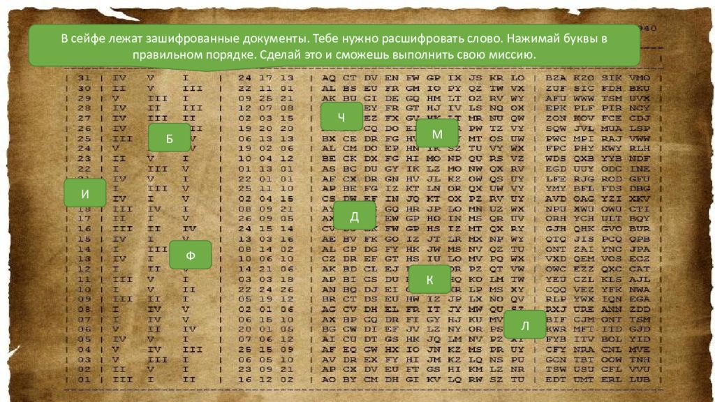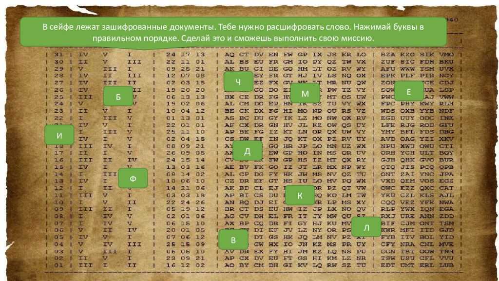 В сейфе лежат зашифрованные документы. Тебе нужно расшифровать слово. Нажимай буквы в правильном порядке. Сделай это и сможешь выполнить свою миссию. Ч Б И Ф Л Д К М