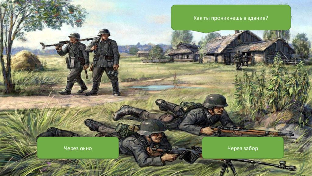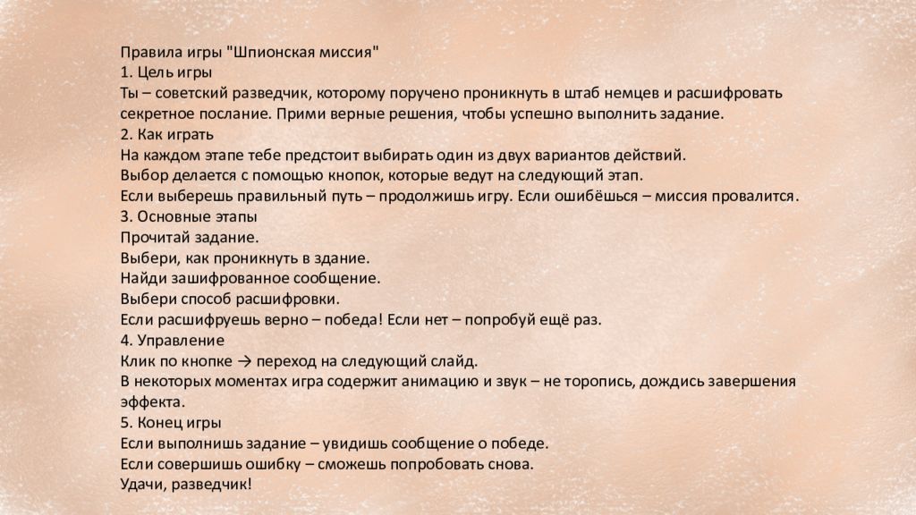 Правила игры "Шпионская миссия" 1. Цель игры Ты – советский разведчик, которому поручено проникнуть в штаб немцев и расшифровать секретное послание. Прими верные решения, чтобы успешно выполнить задание. 2. Как играть На каждом этапе тебе предстоит выбирать один из двух вариантов действий. Выбор делается с помощью кнопок, которые ведут на следующий этап. Если выберешь правильный путь – продолжишь игру. Если ошибёшься – миссия провалится. 3. Основные этапы Прочитай задание. Выбери, как проникнуть в здание. Найди зашифрованное сообщение. Выбери способ расшифровки. Если расшифруешь верно – победа! Если нет – попробуй ещё раз. 4. Управление Клик по кнопке → переход на следующий слайд. В некоторых моментах игра содержит анимацию и звук – не торопись, дождись завершения эффекта. 5. Конец игры Если выполнишь задание – увидишь сообщение о победе. Если совершишь ошибку – сможешь попробовать снова. Удачи, разведчик!