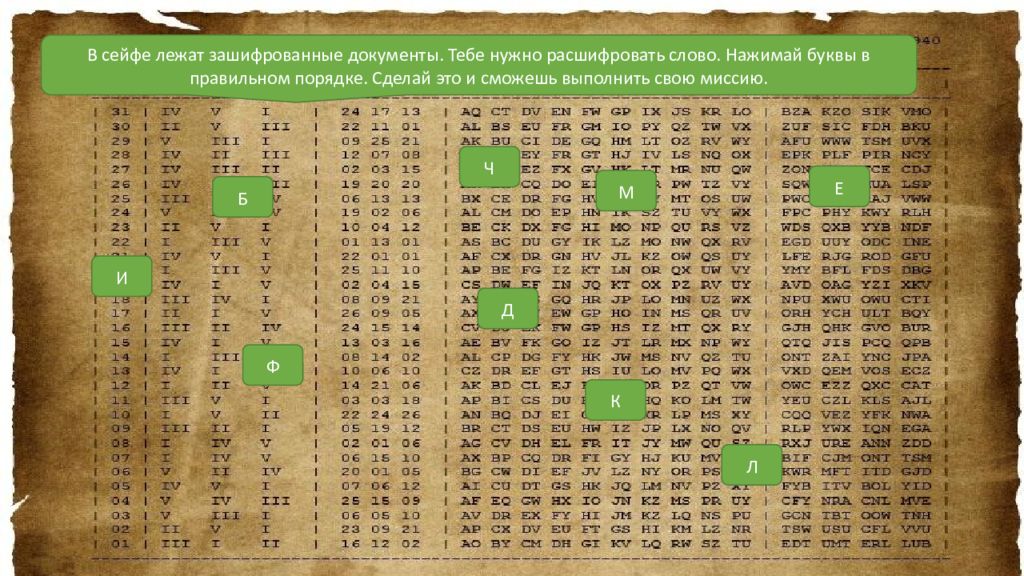 В сейфе лежат зашифрованные документы. Тебе нужно расшифровать слово. Нажимай буквы в правильном порядке. Сделай это и сможешь выполнить свою миссию. Ч Б И Ф Л Д К М Е