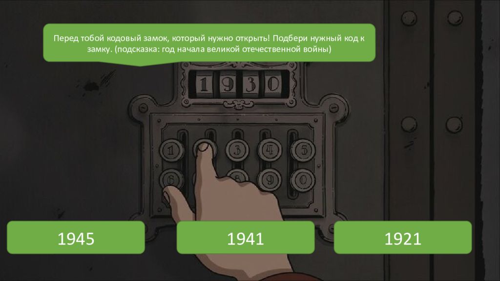 1945 1921 1941 Перед тобой кодовый замок, который нужно открыть! Подбери нужный код к замку. (подсказка: год начала великой отечественной войны)