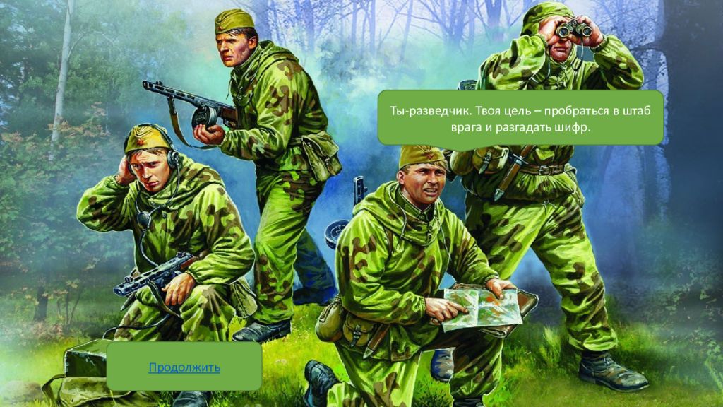 Ты-разведчик. Твоя цель – пробраться в штаб врага и разгадать шифр. Продолжить