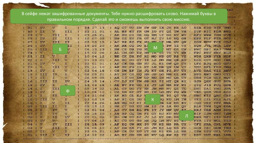 В сейфе лежат зашифрованные документы. Тебе нужно расшифровать слово. Нажимай буквы в правильном порядке. Сделай это и сможешь выполнить свою миссию. Б И Ф Л К М
