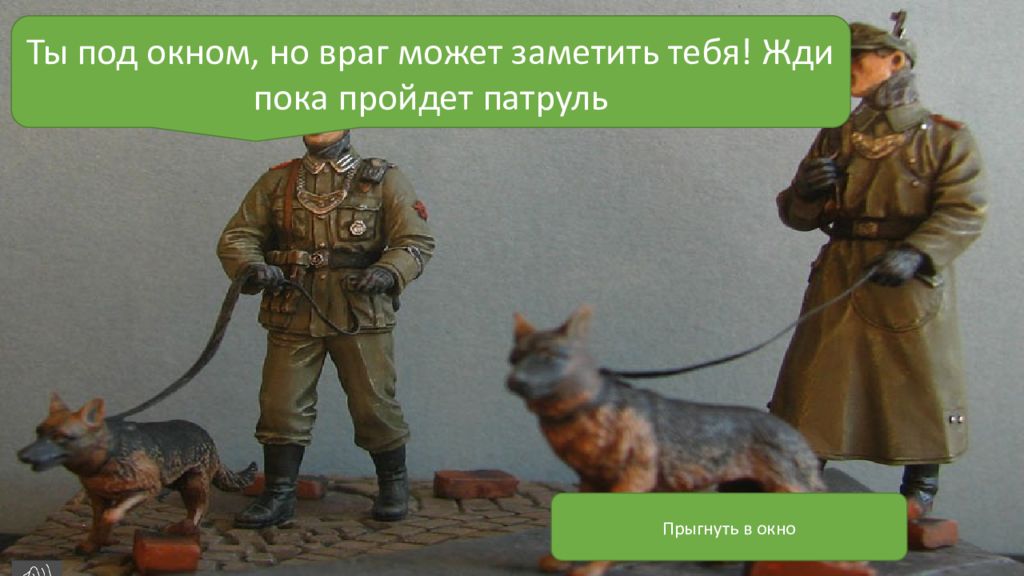 Ты под окном, но враг может заметить тебя! Жди пока пройдет патруль Прыгнуть в окно