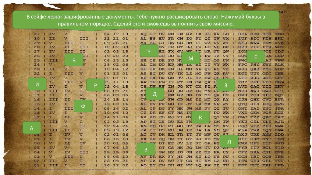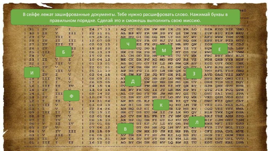 В сейфе лежат зашифрованные документы. Тебе нужно расшифровать слово. Нажимай буквы в правильном порядке. Сделай это и сможешь выполнить свою миссию. В Ч Б И Ф Л Д К З М Е