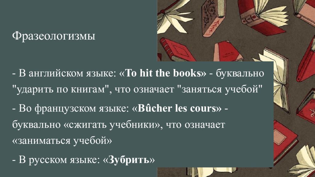 - В английском языке: « To hit the books » - буквально "ударить по книгам", что означает "заняться учебой " - Во французском языке: « Bûcher les cours » - буквально «сжигать учебники», что означает «заниматься учебой» - В русском языке: « Зубрить » Фразеологизмы