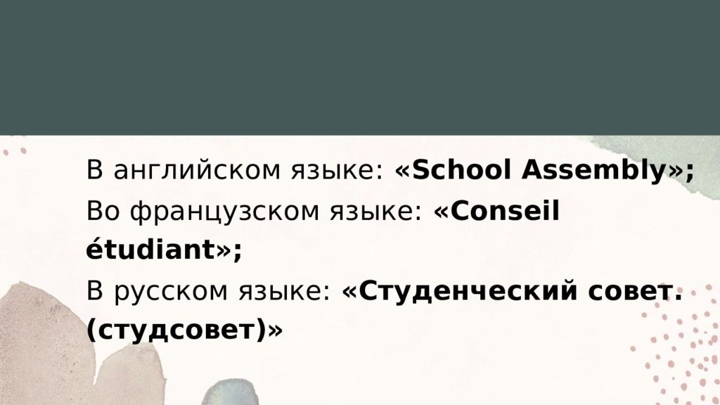 В английском языке: «School Assembly» ; Во французском языке: « Conseil étudiant » ; В русском языке: «Студенческий совет. (студсовет)»