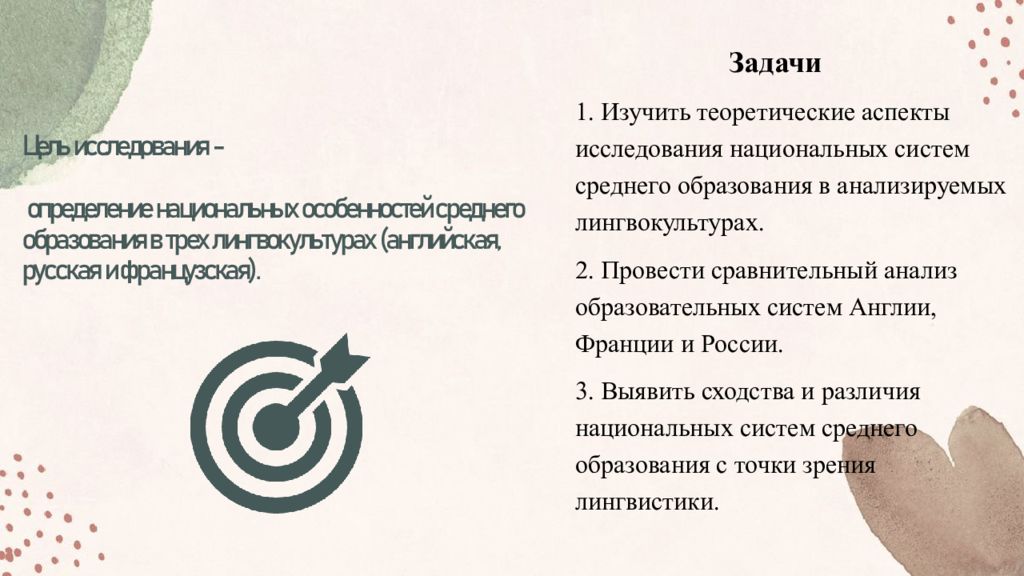 Задачи 1. Изучить теоретические аспекты исследования национальных систем среднего образования в анализируемых лингвокультурах. 2. Провести сравнительный анализ образовательных систем Англии, Франции и России. 3. Выявить сходства и различия национальных систем среднего образования с точки зрения лингвистики.