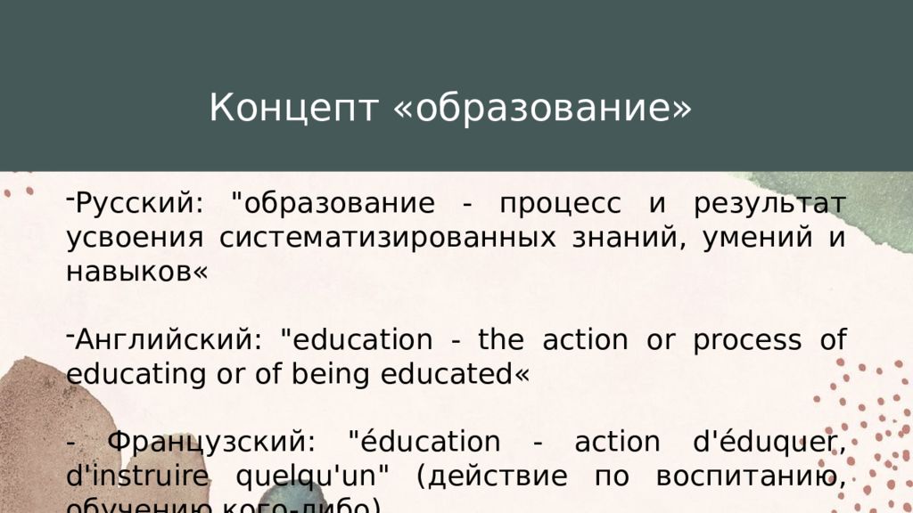 Концепт «образование » Русский : "образование - процесс и результат усвоения систематизированных знаний, умений и навыков« Английский : " education - the action or process of educating or of being educated« - Французский: " éducation - action d'éduquer, d'instruire quelqu'un " ( действие по воспитанию, обучению кого-либо)