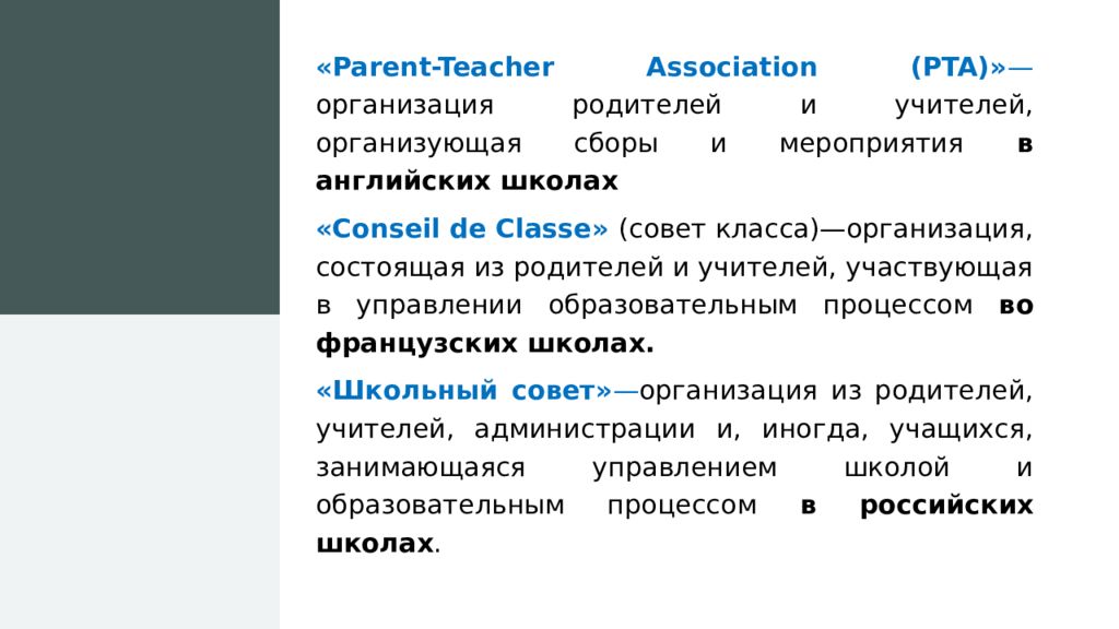 « Parent-Teacher Association (PTA) » — о рганизация родителей и учителей, организующая сборы и мероприятия в английских школах « Conseil de Classe » ( совет класса )—организация, состоящая из родителей и учителей, участвующая в управлении образовательным процессом во французских школах. «Школьный совет » — о рганизация из родителей, учителей, администрации и, иногда, учащихся, занимающаяся управлением школой и образовательным процессом в российских школах.