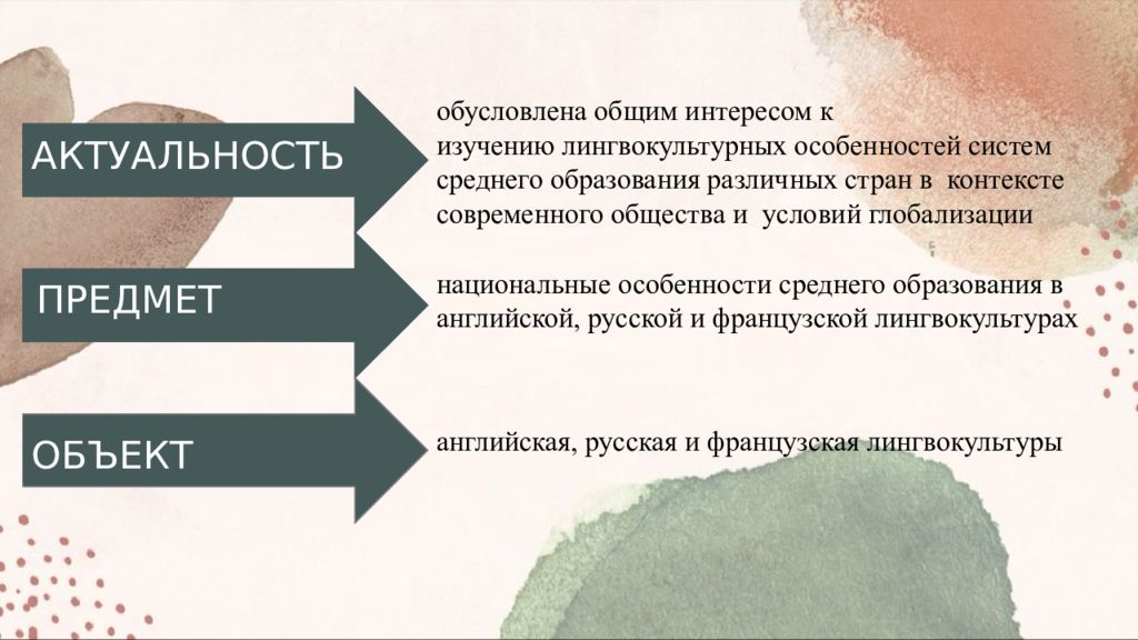 национальные особенности среднего образования в английской, русской и французской лингвокультурах обусловлена общим интересом к изучению лингвокультурных особенностей систем среднего образования различных стран в контексте современного общества и условий глобализации ОБЪЕКТ английская, русская и французская лингвокультуры ПРЕДМЕТ АКТУАЛЬНОСТЬ