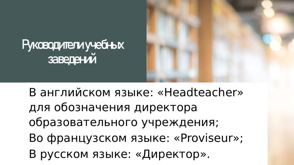 В английском языке : «Headteacher» для обозначения директора образовательного учреждения ; В о французском языке : « Proviseur »; В русском языке : «Директор».