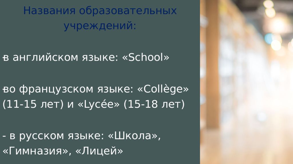 Названия о бразовательных учреждений: в английском языке: « School » во французском языке: « Collège » (11-15 лет) и « Lycée» (15-18 лет ) - в русском языке: «Школа», «Гимназия», «Лицей»