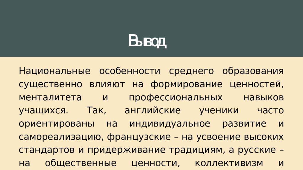 Н ациональные особенности среднего образования существенно влияют на формирование ценностей, менталитета и профессиональных навыков учащихся. Так, английские ученики часто ориентированы на индивидуальное развитие и самореализацию, французские – на усвоение высоких стандартов и придерживание традициям, а русские – на общественные ценности, коллективизм и прагматичный подход к обучению.