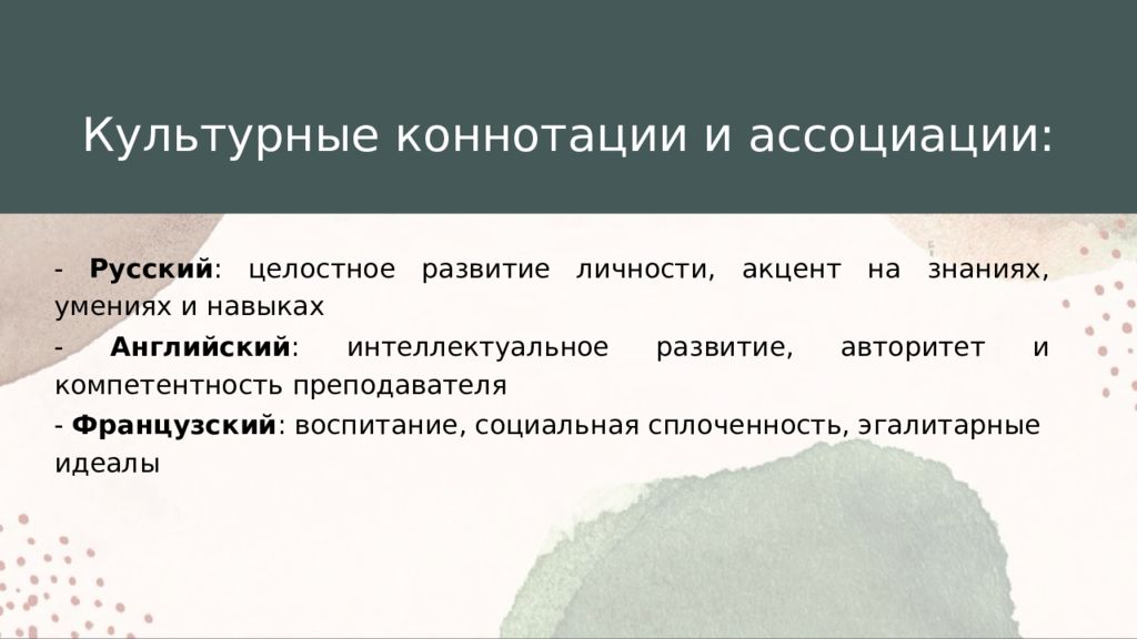 - Русский : целостное развитие личности, акцент на знаниях, умениях и навыках - Английский : интеллектуальное развитие, авторитет и компетентность преподавателя - Французский : воспитание, социальная сплоченность, эгалитарные идеалы