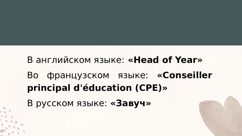 В английском языке: «Head of Year » Во французском языке: « Conseiller principal d'éducation (CPE)» В русском языке: «Завуч»