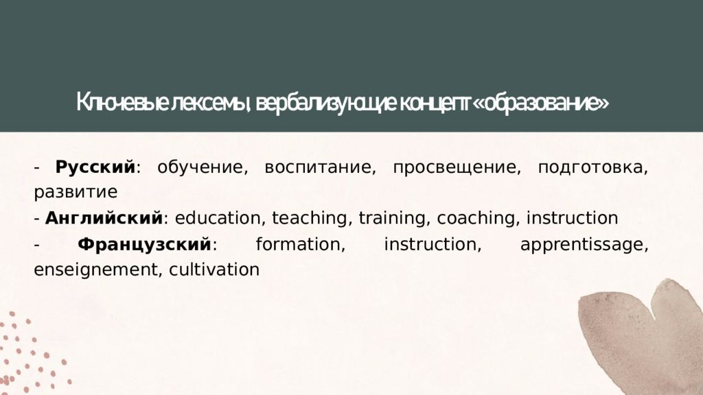 Слайд 5: Ключевые лексемы, вербализующие концепт «образование »