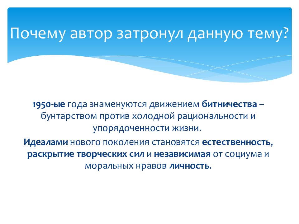 1950-ые года знаменуются движением битничества – бунтарством против холодной рациональности и упорядоченности жизни. Идеалами нового поколения становятся естественность, раскрытие творческих сил и независимая от социума и моральных нравов личность. Почему автор затронул данную тему?