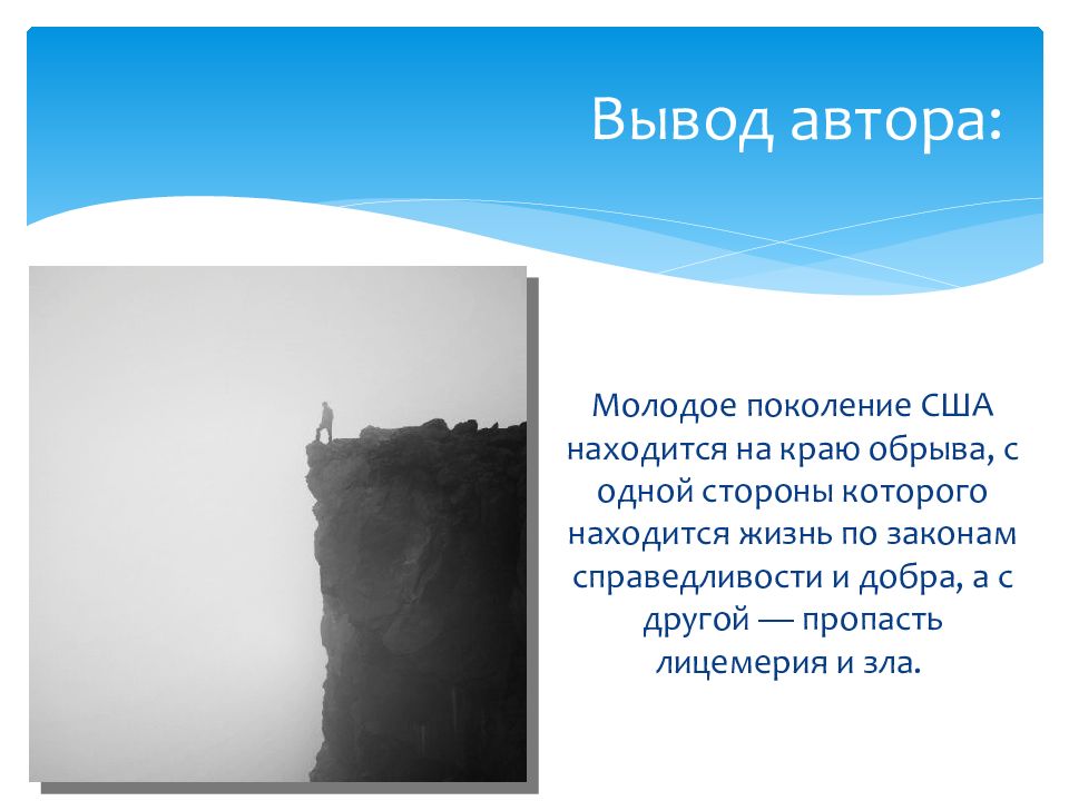 Молодое поколение США находится на краю обрыва, с одной стороны которого находится жизнь по законам справедливости и добра, а с другой — пропасть лицемерия и зла. Вывод автора :