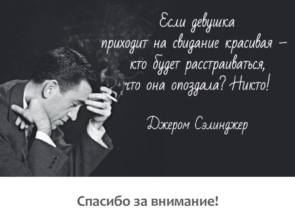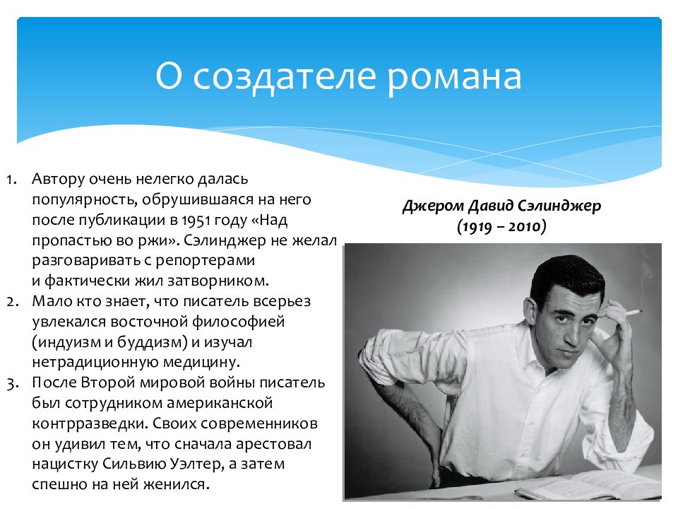 Автору очень нелегко далась популярность, обрушившаяся на него после публикации в 1951 году «Над пропастью во ржи». Сэлинджер не желал разговаривать с репортерами и фактически жил затворником. Мало кто знает, что писатель всерьез увлекался восточной философией (индуизм и буддизм) и изучал нетрадиционную медицину. После Второй мировой войны писатель был сотрудником американской контрразведки. Своих современников он удивил тем, что сначала арестовал нацистку Сильвию Уэлтер, а затем спешно на ней женился. Джером Давид Сэлинджер (1919 – 2010)