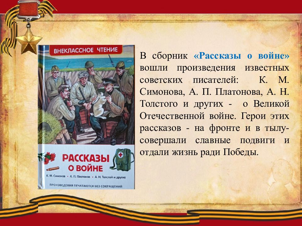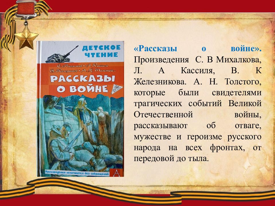 «Рассказы о войне». Произведения С. В Михалкова, Л. А Кассиля, В. К Железникова. А. Н. Толстого, которые были свидетелями трагических событий Великой Отечественной войны, рассказывают об отваге, мужестве и героизме русского народа на всех фронтах, от передовой до тыла.