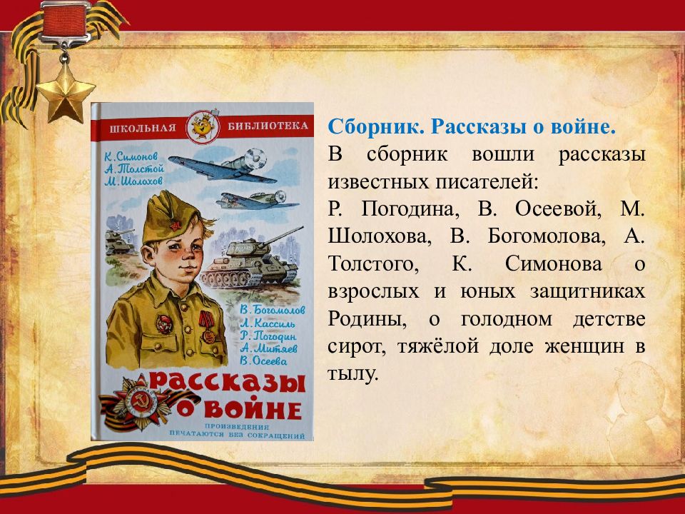 Сборник. Рассказы о войне. В сборник вошли рассказы известных писателей: Р. Погодина, В. Осеевой, М. Шолохова, В. Богомолова, А. Толстого, К. Симонова о взрослых и юных защитниках Родины, о голодном детстве сирот, тяжёлой доле женщин в тылу.