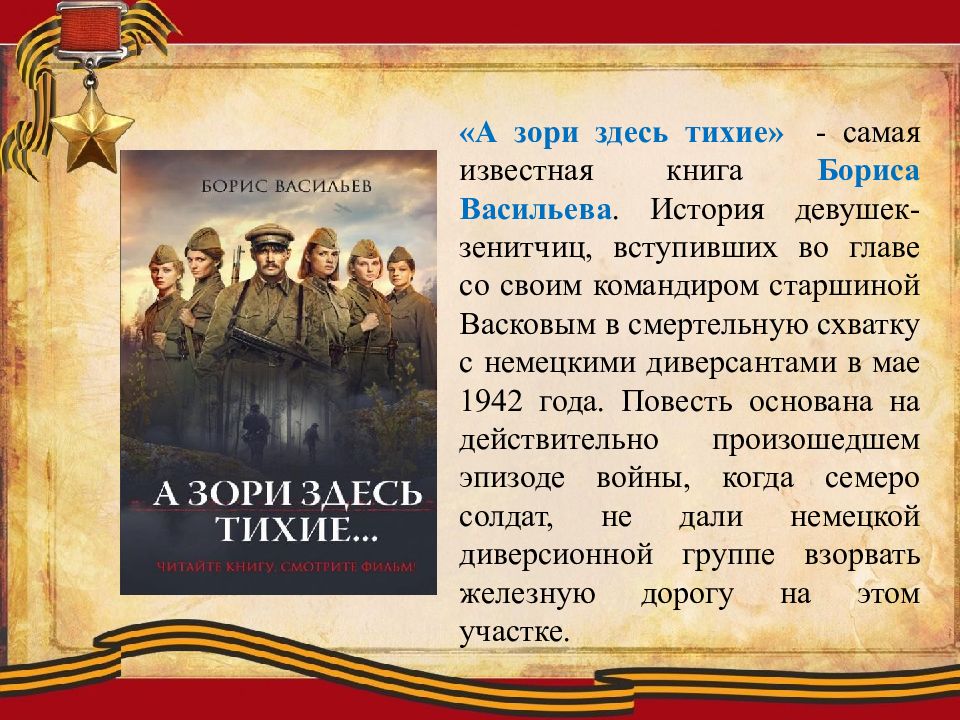 «А зори здесь тихие» - самая известная книга Бориса Васильева. История девушек-зенитчиц, вступивших во главе со своим командиром старшиной Васковым в смертельную схватку с немецкими диверсантами в мае 1942 года. Повесть основана на действительно произошедшем эпизоде войны, когда семеро солдат, не дали немецкой диверсионной группе взорвать железную дорогу на этом участке.