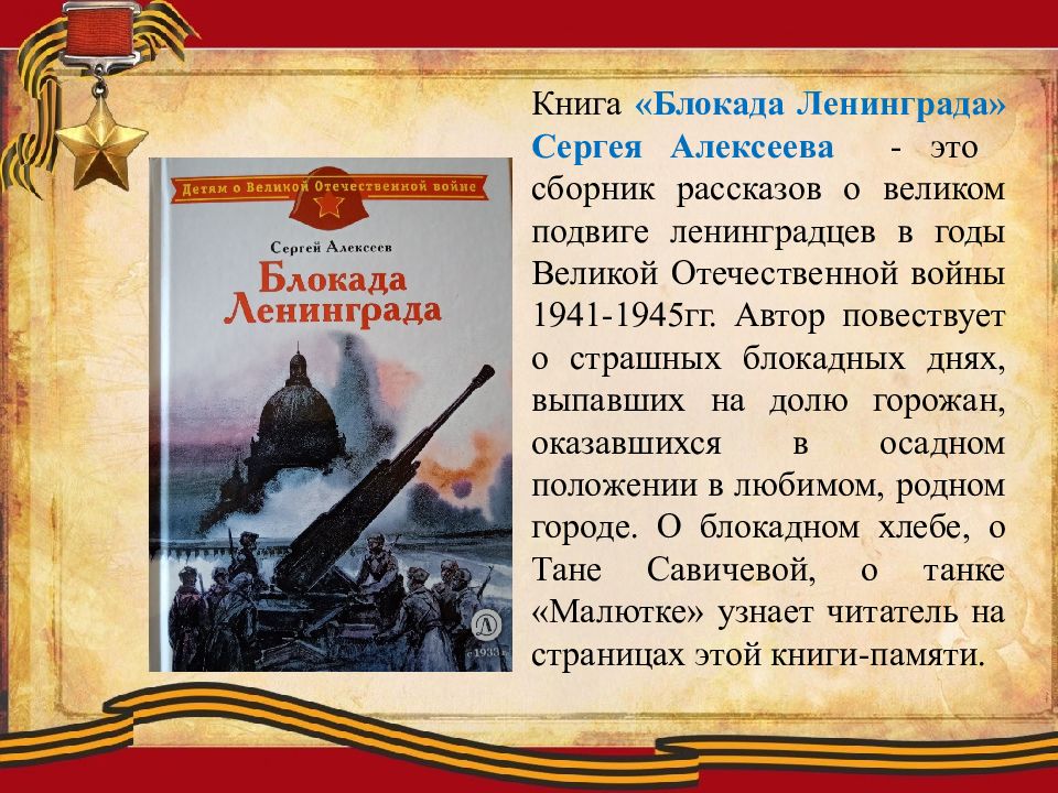 Книга «Блокада Ленинграда» Сергея Алексеева - это сборник рассказов о великом подвиге ленинградцев в годы Великой Отечественной войны 1941-1945гг. Автор повествует о страшных блокадных днях, выпавших на долю горожан, оказавшихся в осадном положении в любимом, родном городе. О блокадном хлебе, о Тане Савичевой, о танке «Малютке» узнает читатель на страницах этой книги-памяти.