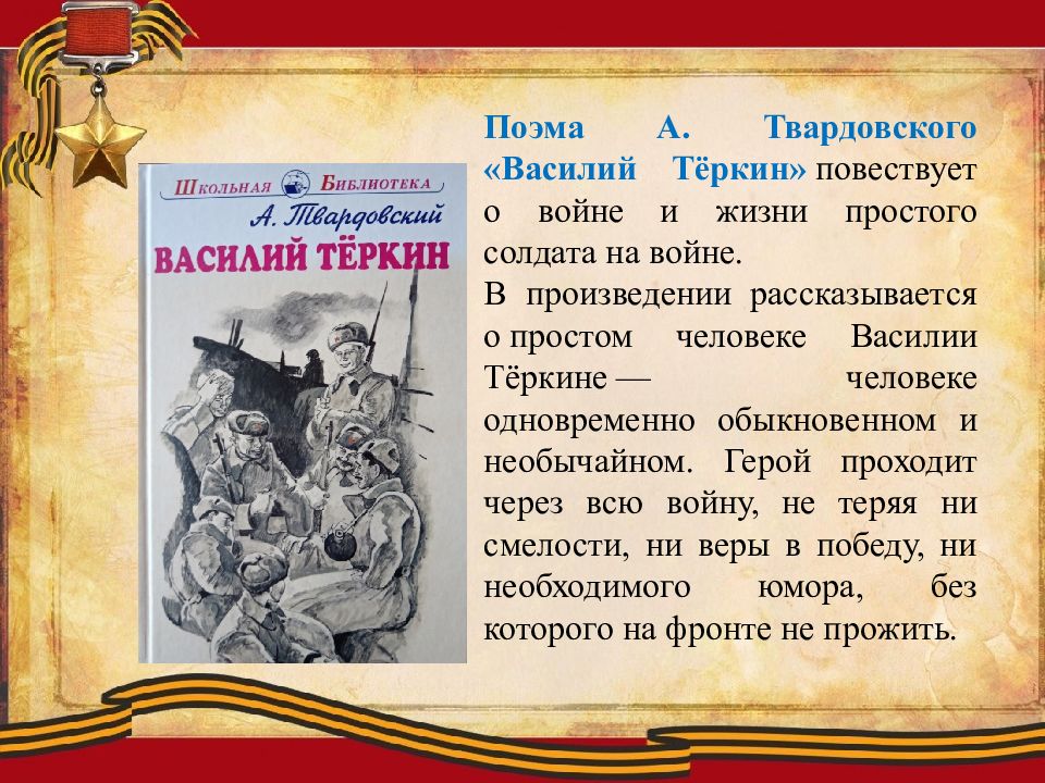 Поэма А. Твардовского «Василий Тёркин» повествует о войне и жизни простого солдата на войне. В произведении рассказывается о простом человеке Василии Тёркине — человеке одновременно обыкновенном и необычайном. Герой проходит через всю войну, не теряя ни смелости, ни веры в победу, ни необходимого юмора, без которого на фронте не прожить.