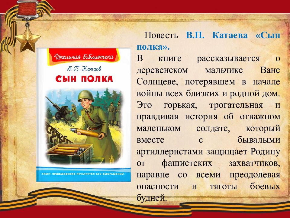 Повесть В.П. Катаева «Сын полка». В книге рассказывается о деревенском мальчике Ване Солнцеве, потерявшем в начале войны всех близких и родной дом. Это горькая, трогательная и правдивая история об отважном маленьком солдате, который вместе с бывалыми артиллеристами защищает Родину от фашистских захватчиков, наравне со всеми преодолевая опасности и тяготы боевых будней.