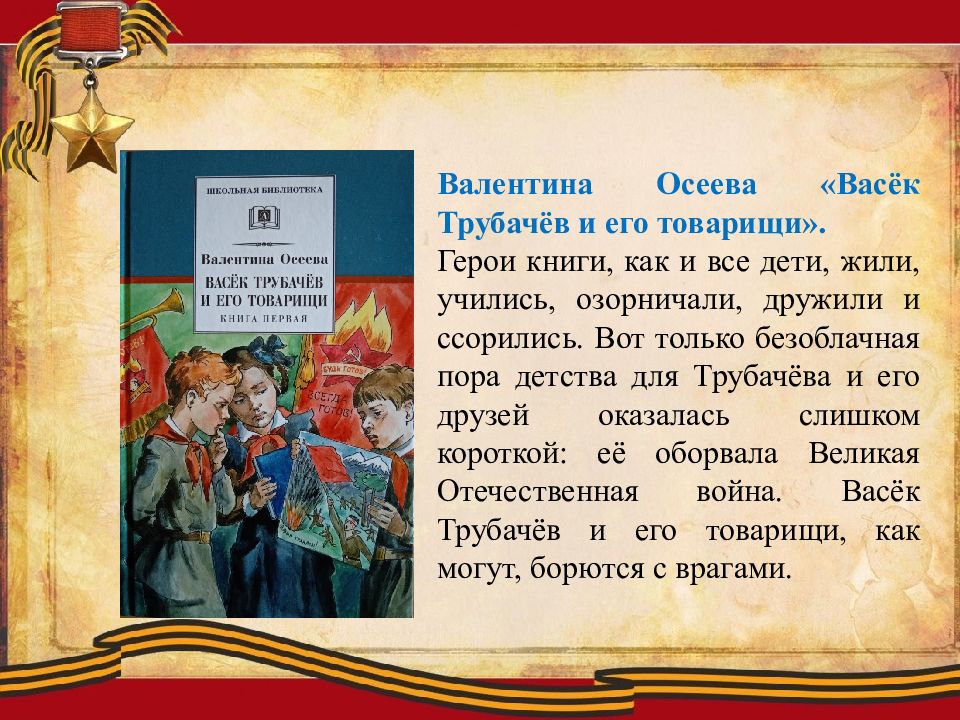 Валентина Осеева «Васёк Трубачёв и его товарищи ». Герои книги, как и все дети, жили, учились, озорничали, дружили и ссорились. Вот только безоблачная пора детства для Трубачёва и его друзей оказалась слишком короткой: её оборвала Великая Отечественная война. Васёк Трубачёв и его товарищи, как могут, борются с врагами.