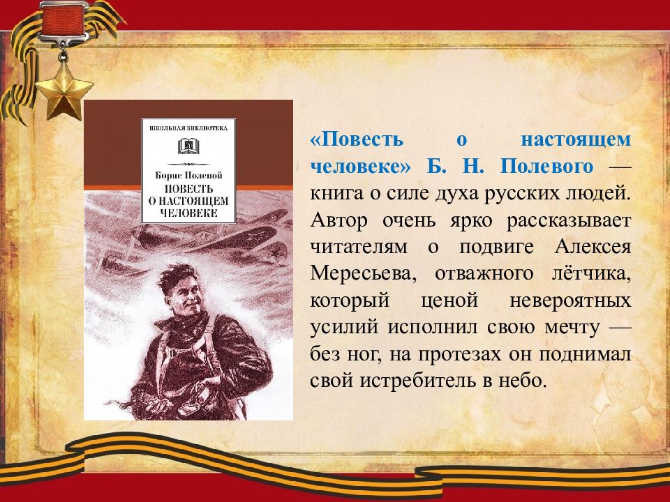 « Повесть о настоящем человеке » Б. Н. Полевого — книга о силе духа русских людей. Автор очень ярко рассказывает читателям о подвиге Алексея Мересьева, отважного лётчика, который ценой невероятных усилий исполнил свою мечту — без ног, на протезах он поднимал свой истребитель в небо.
