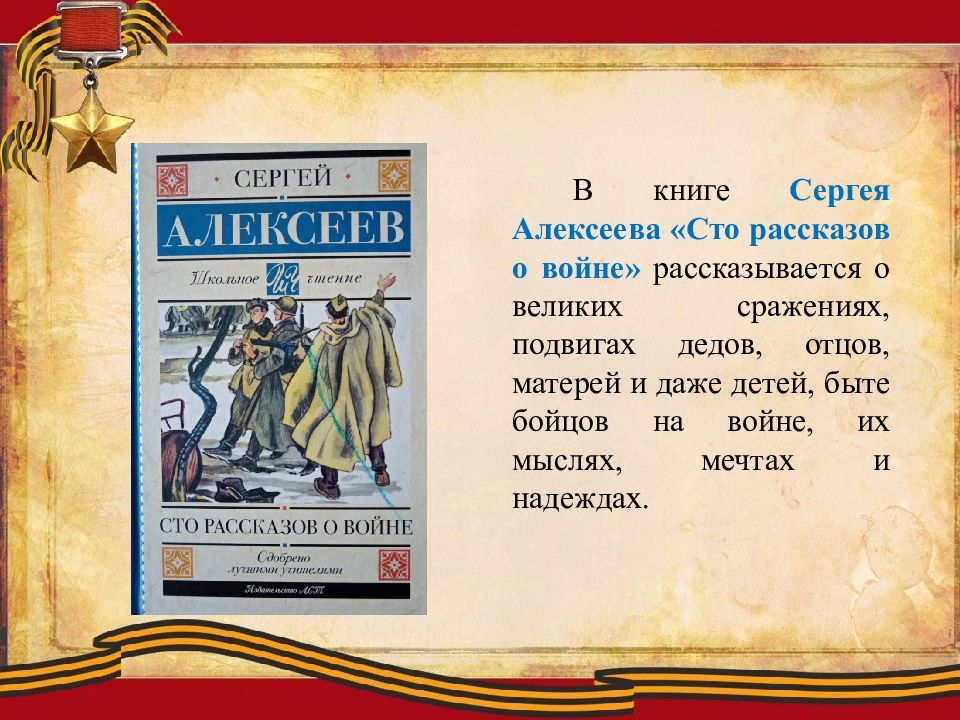 В книге Сергея Алексеева «Сто рассказов о войне» рассказывается о великих сражениях, подвигах дедов, отцов, матерей и даже детей, быте бойцов на войне, их мыслях, мечтах и надеждах.