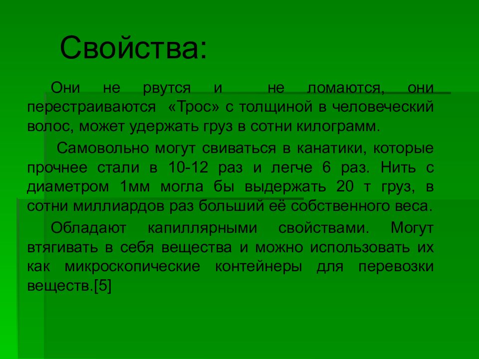 Они не рвутся и не ломаются, они перестраиваются «Трос» с толщиной в человеческий волос, может удержать груз в сотни килограмм. Самовольно могут свиваться в канатики, которые прочнее стали в 10-12 раз и легче 6 раз. Нить с диаметром 1мм могла бы выдержать 20 т груз, в сотни миллиардов раз больший её собственного веса. Обладают капиллярными свойствами. Могут втягивать в себя вещества и можно использовать их как микроскопические контейнеры для перевозки веществ. [ 5 ] Свойства: