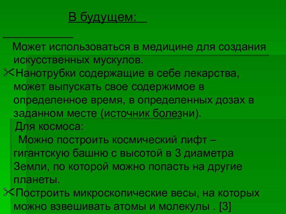 В будущем: Может использоваться в медицине для создания искусственных мускулов. Нанотрубки содержащие в себе лекарства, может выпускать свое содержимое в определенное время, в определенных дозах в заданном месте (источник болезни). Для космоса: Можно построить космический лифт – гигантскую башню с высотой в 3 диаметра Земли, по которой можно попасть на другие планеты. Построить микроскопические весы, на которых можно взвешивать атомы и молекулы. [ 3 ]