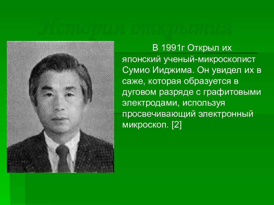 В 1991г Открыл их японский ученый-микроскопист Сумио Ииджима. Он увидел их в саже, которая образуется в дуговом разряде с графитовыми электродами, используя просвечивающий электронный микроскоп. [ 2 ] История открытия