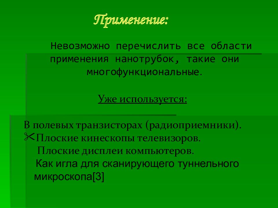 Уже используется: В полевых транзисторах (радиоприемники). Плоские кинескопы телевизоров. Плоские дисплеи компьютеров. Как игла для сканирующего туннельного микроскопа [ 3 ] Невозможно перечислить все области применения нанотрубок, такие они многофункциональные. Применение: