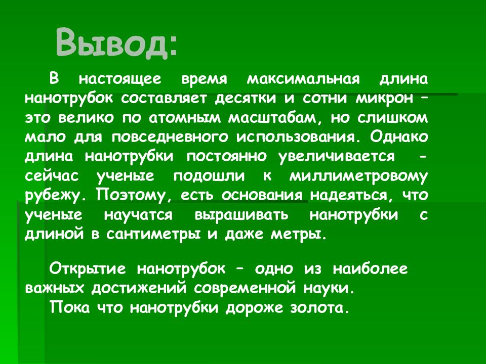 В настоящее время максимальная длина нанотрубок составляет десятки и сотни микрон – это велико по атомным масштабам, но слишком мало для повседневного использования. Однако длина нанотрубки постоянно увеличивается - сейчас ученые подошли к миллиметровому рубежу. Поэтому, есть основания надеяться, что ученые научатся вырашивать нанотрубки с длиной в сантиметры и даже метры. Открытие нанотрубок – одно из наиболее важных достижений современной науки. Пока что нанотрубки дороже золота. Вывод :