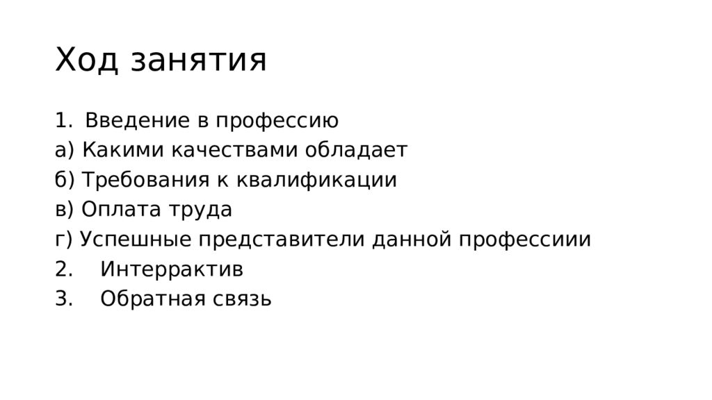 Введение в профессию а) Какими качествами обладает б) Требования к квалификации в) Оплата труда г) Успешные представители данной профессиии 2. Интеррактив 3. Обратная связь