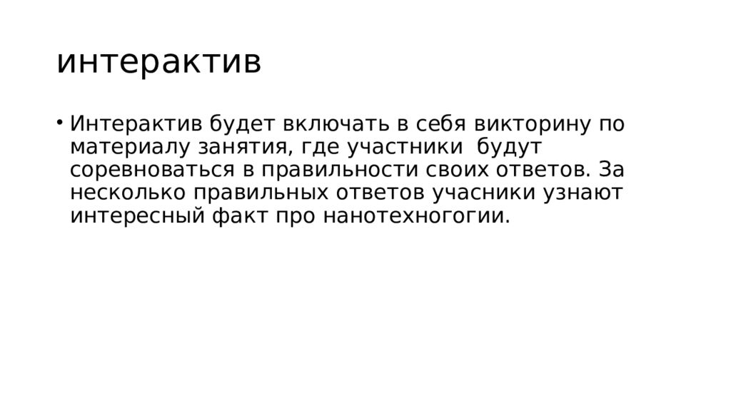 Интерактив будет включать в себя викторину по материалу занятия, где участники будут соревноваться в правильности своих ответов. За несколько правильных ответов учасники узнают интересный факт про нанотехногогии.