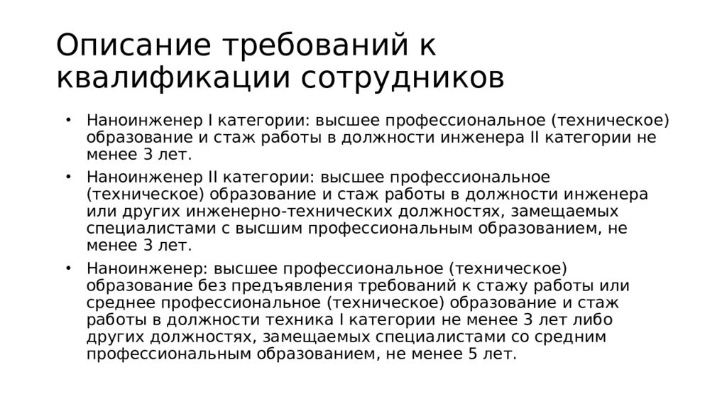 Наноинженер I категории: высшее профессиональное (техническое) образование и стаж работы в должности инженера II категории не менее 3 лет. Наноинженер II категории: высшее профессиональное (техническое) образование и стаж работы в должности инженера или других инженерно-технических должностях, замещаемых специалистами с высшим профессиональным образованием, не менее 3 лет. Наноинженер : высшее профессиональное (техническое) образование без предъявления требований к стажу работы или среднее профессиональное (техническое) образование и стаж работы в должности техника I категории не менее 3 лет либо других должностях, замещаемых специалистами со средним профессиональным образованием, не менее 5 лет.