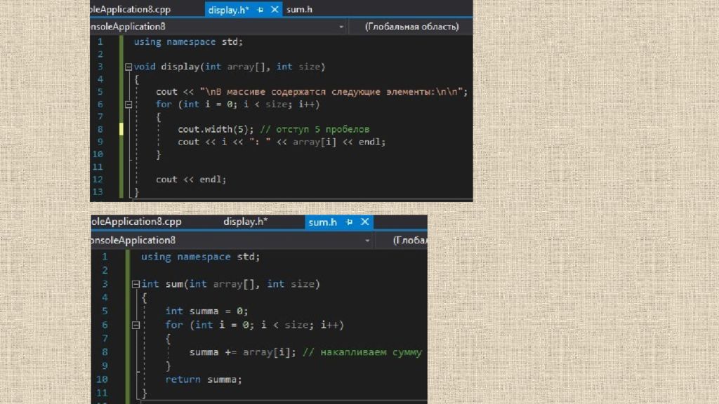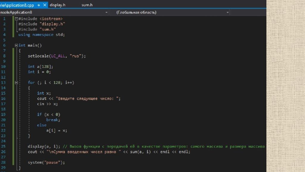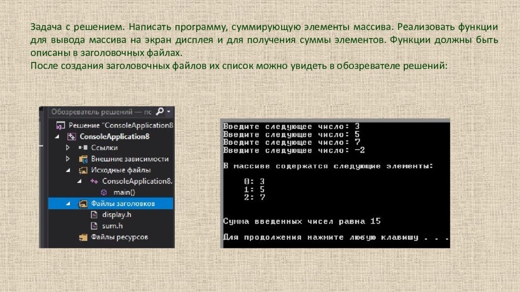 Задача с решением. Написать программу, суммирующую элементы массива. Реализовать функции для вывода массива на экран дисплея и для получения суммы элементов. Функции должны быть описаны в заголовочных файлах. После создания заголовочных файлов их список можно увидеть в обозревателе решений: