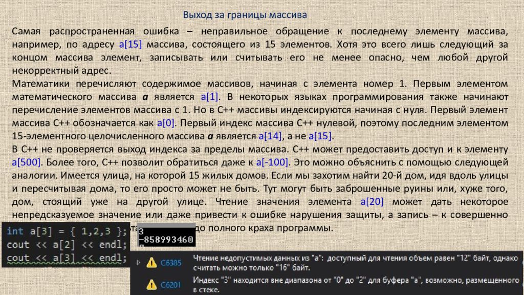 Выход за границы массива Самая распространенная ошибка – неправильное обращение к последнему элементу массива, например, по адресу a[15] массива, состоящего из 15 элементов. Хотя это всего лишь следующий за концом массива элемент, записывать или считывать его не менее опасно, чем любой другой некорректный адрес. Математики перечисляют содержимое массивов, начиная с элемента номер 1. Первым элементом математического массива a является a[ 1 ]. В некоторых языках программирования также начинают перечисление элементов массива с 1. Но в C++ массивы индексируются начиная с нуля. Первый элемент массива C++ обозначается как a[ 0 ]. Первый индекс массива C++ нулевой, поэтому последним элементом 15-элементного целочисленного массива a является a[ 14 ], а не a[15]. В C++ не проверяется выход индекса за пределы массива. C++ может предоставить доступ и к элементу a[500]. Более того, C++ позволит обратиться даже к a[-100]. Это можно объяснить с помощью следующей аналогии. Имеется улица, на которой 15 жилых домов. Если мы захотим найти 20-й дом, идя вдоль улицы и пересчитывая дома, то его просто может не быть. Тут могут быть заброшенные руины или, хуже того, дом, стоящий уже на другой улице. Чтение значения элемента a[20] может дать некоторое непредсказуемое значение или даже привести к ошибке нарушения защиты, а запись – к совершенно непредсказуемым результатам вплоть до полного краха программы.